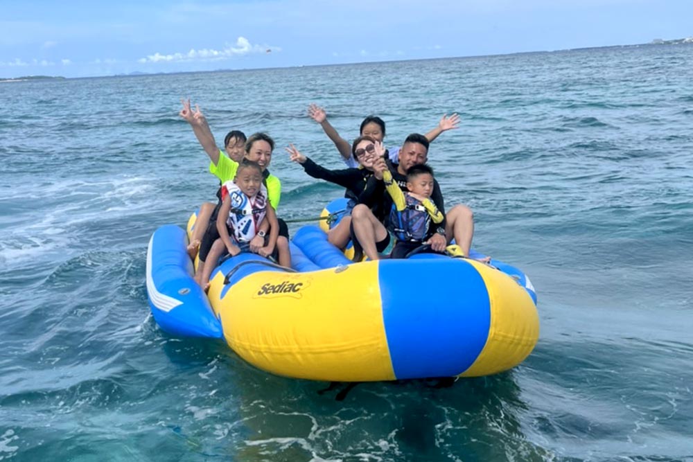 バナナボートに乗って水しぶきを浴びながら海を走る爽快感、いつ振り落とされてもおかしくないスリルは大人もはまること間違いなしです!