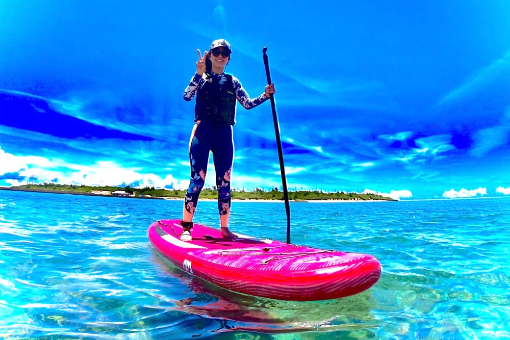 サーフボードの上に立ち、一本のパドルで左右を交互に漕ぎ、水面を進むマリンスポーツです!